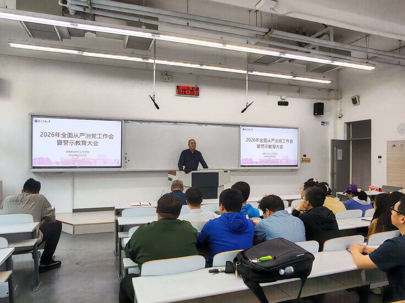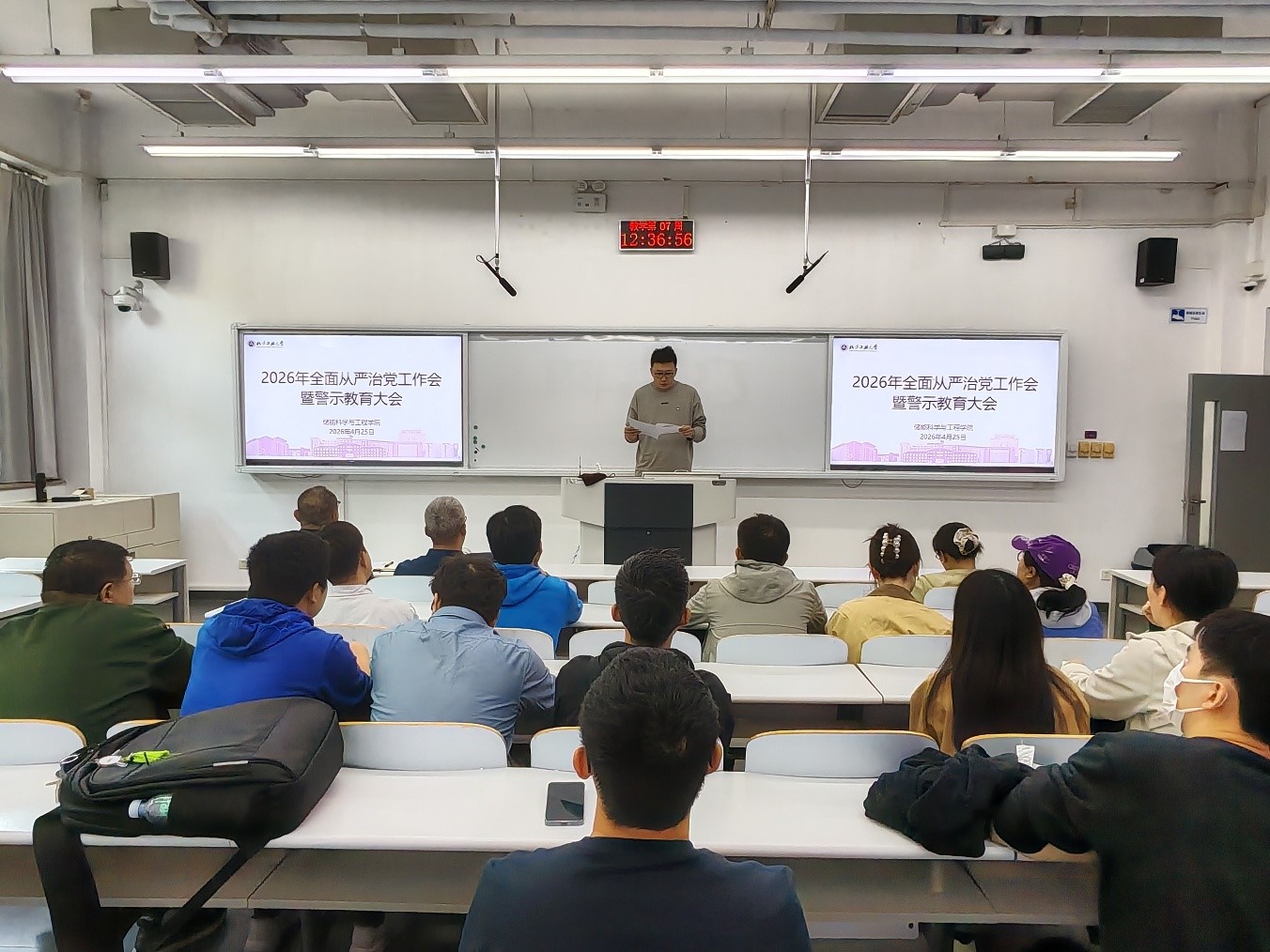 4月25日中午,太阳集团城娱8722在瀚学楼0109教室召开2026年全面从严治党工作会暨警示教育大会。学院全体教职工参会,党总支副书记李旭主持会议。